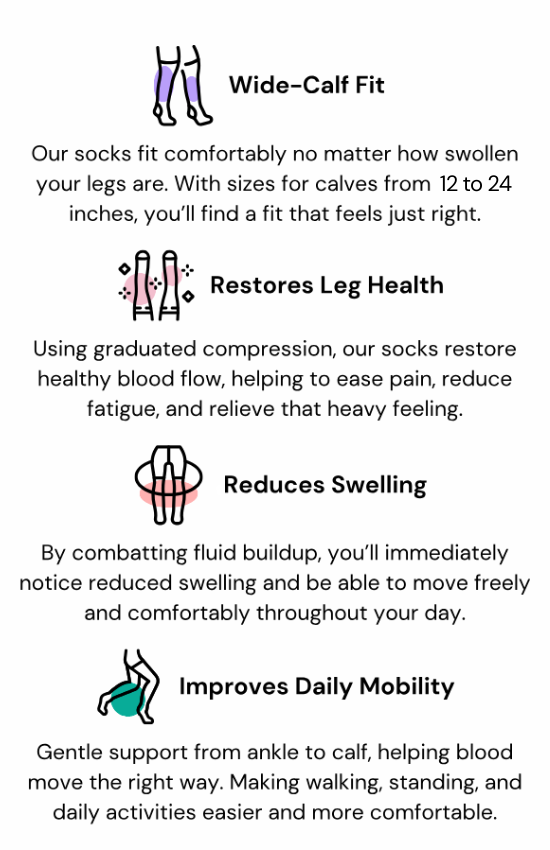 Our socks are designed specifically for wide calves, delivering gentle, supportive compression that never restricts movement or circulation—so you can feel great all day, every day.